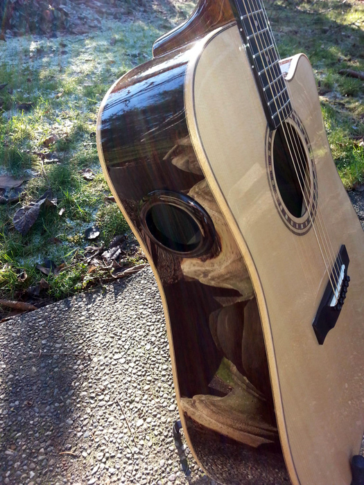 Coming from Music City Guitars and Gear, Nashville, TN, the set-up was fine.  The dread plays nicely and feels sound.  It’s volume is as expected from a dreadnought, and has a nice even tone from bass to treble.  Subjectively, there is a bit more of a “traditional” dreadnought tone offered than by my Cordoba Acero D11-CE (see my review), and Breedlove Pro Series dreadnoughts.  This Bedell comes with Fishman electronics:  volume and tone controls located at the lip of the sound hole.